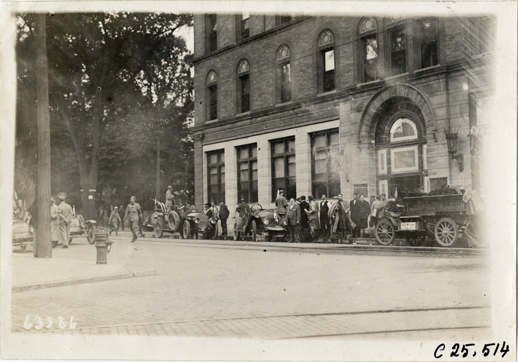 View of motorists with cars and Randolph truck lined up on sidewalk during the 1910 Munsey Historic Tour. Brick and stone building in background. Organized by the Munsey newspapers, the endurance contest covered a route through ten states. Stamped on back: "Spooner & Wells, Inc., photographers, telephones 3472-3473 Columbus, 1931 Broadway, New York." Handwritten on back: "Tours--Munsey Historic Tour, 1910."