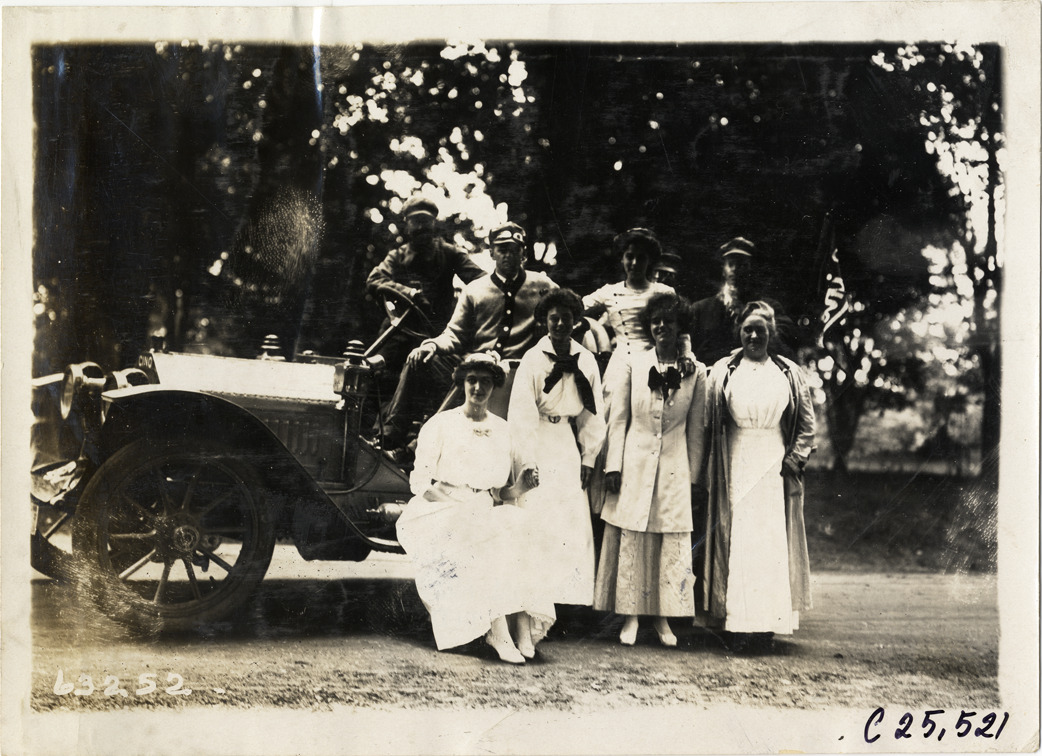 Motorists and women posing with automobile, 1910 Munsey Historic Tour