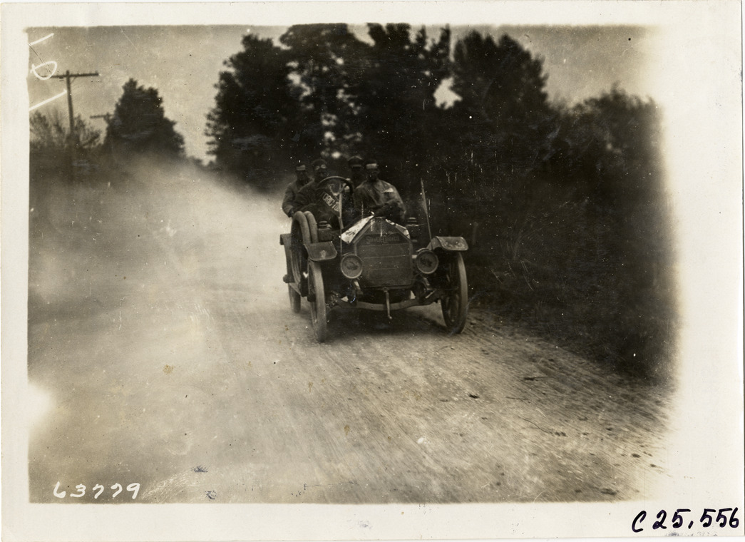 View of motorists in Staver-Chicago car traveling on rural dirt road during the 1910 Munsey Historic Tour. Organized by the Munsey newspapers, the endurance contest covered a route through ten states. Stamped on back: "Spooner & Wells, Inc., photographers, telephones 3472-3473 Columbus, 1931 Broadway, New York." Handwritten on back: "Tours--Munsey Historic Tour, 1910."