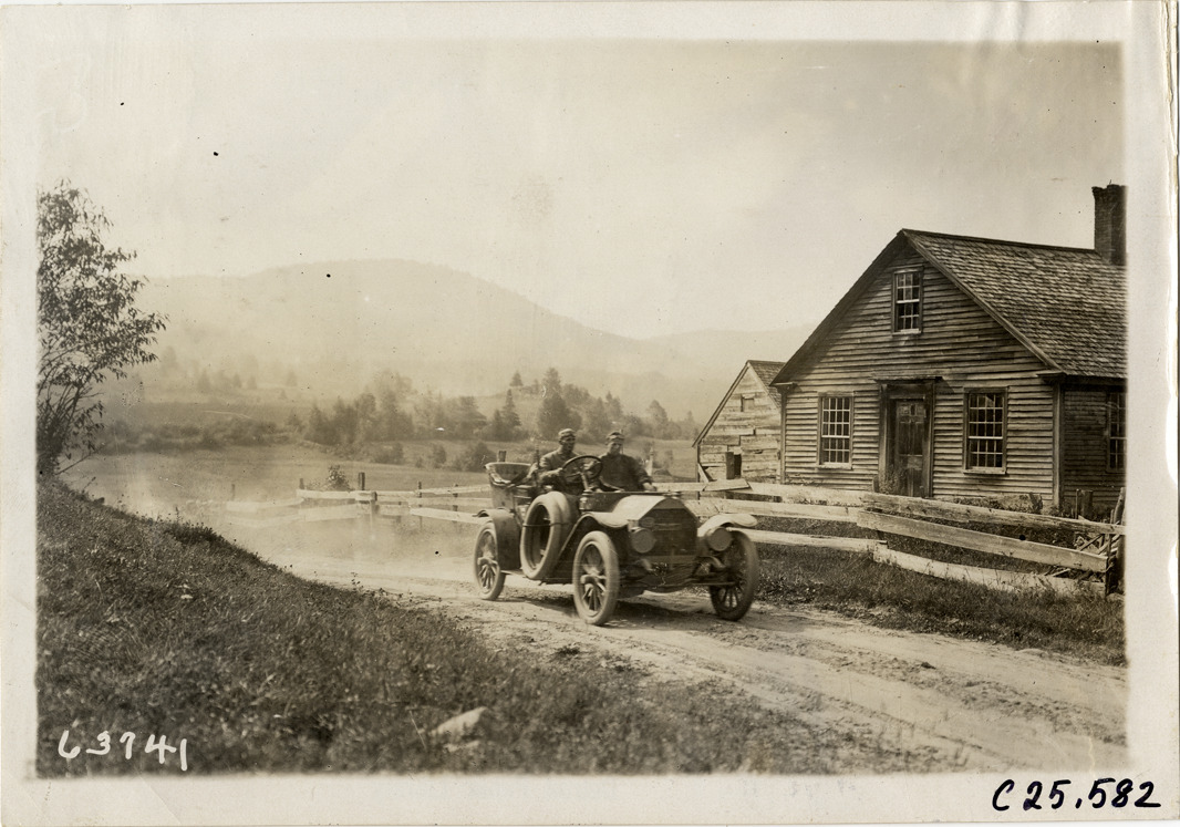 View of motorists in Great Western car no. 18 passing wooden-frame house during the 1910 Munsey Historic Tour. Organized by the Munsey newspapers, the endurance contest covered a route through ten states. Stamped on back: "Spooner & Wells, Inc., photographers, telephones 3472-3473 Columbus, 1931 Broadway, New York." Handwritten on back: "Tours--Munsey Historic Tour, 1910."