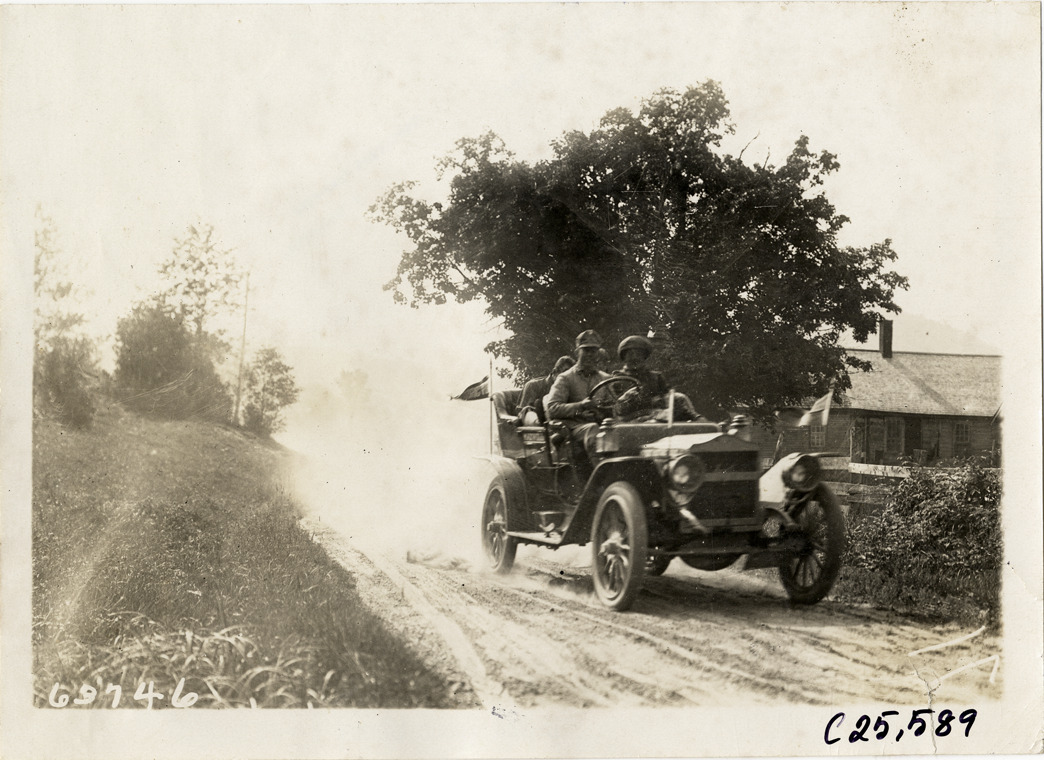 Motorists in automobile traveling on rural road, 1910 Munsey Historic Tour