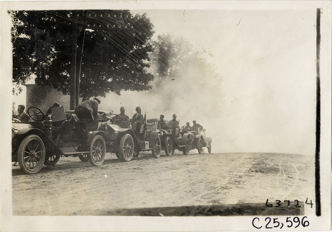 Automobiles lined up in road, 1910 Munsey Historic Tour
