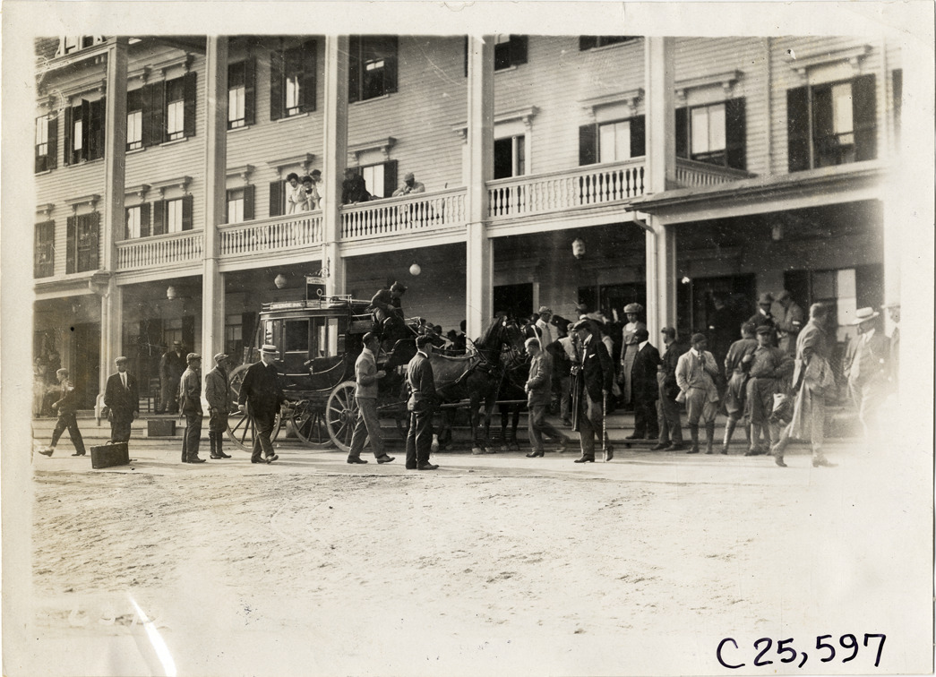 View of spectators surrounding horse-drawn stagecoach in front of hotel during the 1910 Munsey Historic Tour. Organized by the Munsey newspapers, the endurance contest covered a route through ten states. Stamped on back: "Spooner & Wells, Inc., photographers, telephones 3472-3473 Columbus, 1931 Broadway, New York." Handwritten on back: "Tours--Munsey Historic Tour, 1910."