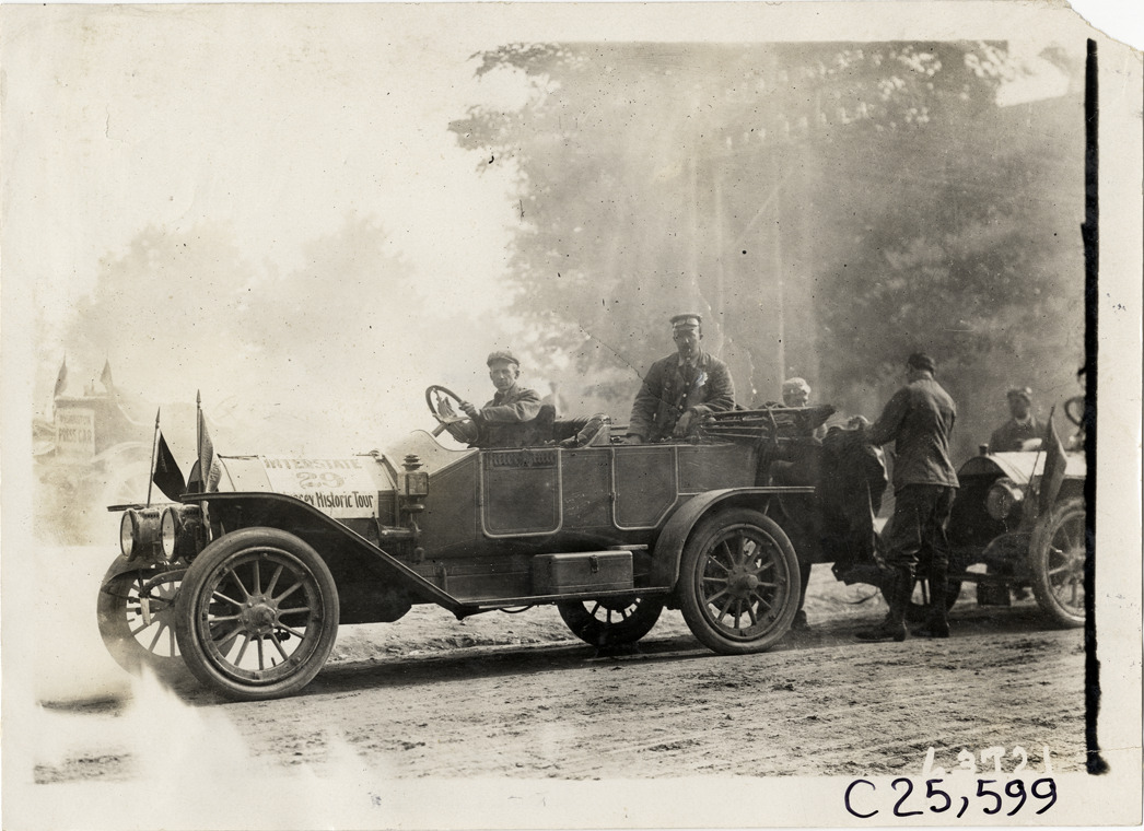 View of motorists posing in Inter-State car no. 29 during the 1910 Munsey Historic Tour. Organized by the Munsey newspapers, the endurance contest covered a route through ten states. Stamped on back: "Spooner & Wells, Inc., photographers, telephones 3472-3473 Columbus, 1931 Broadway, New York." Handwritten on back: "Tours--Munsey Historic Tour, 1910."