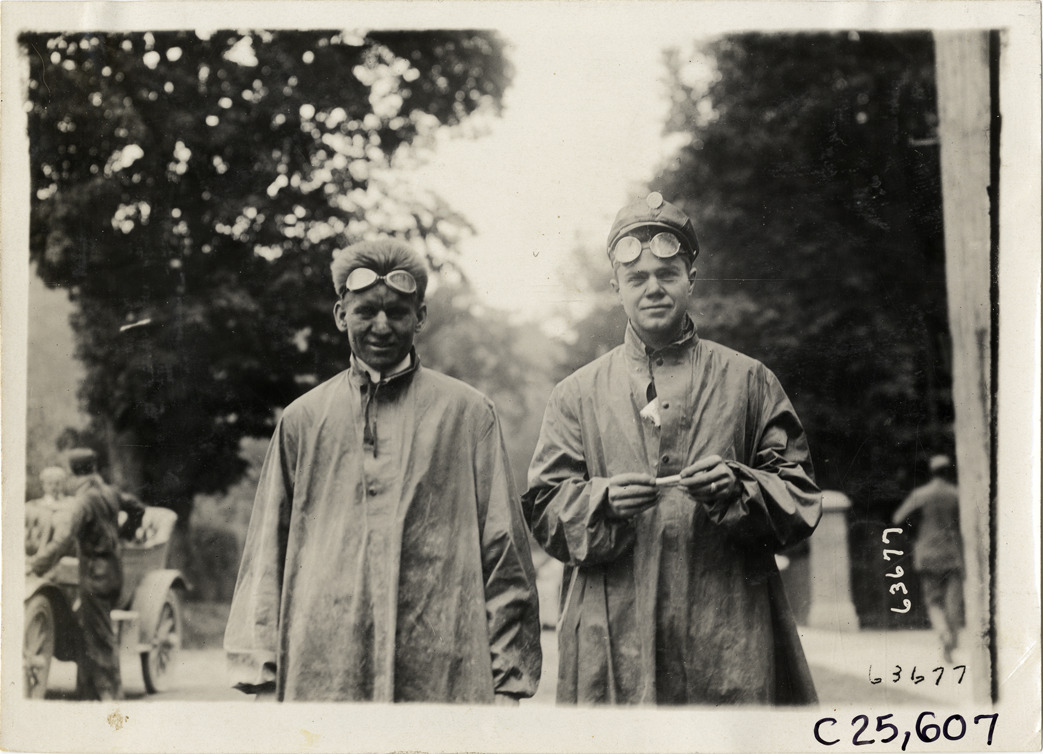 Close-up view of two motorists during the 1910 Munsey Historic Tour. Men wear driving coats and goggles. Organized by the Munsey newspapers, the endurance contest covered a route through ten states. Stamped on back: "Spooner & Wells, Inc., photographers, telephones 3472-3473 Columbus, 1931 Broadway, New York." Handwritten on back: "Tours--Munsey Historic Tour, 1910."