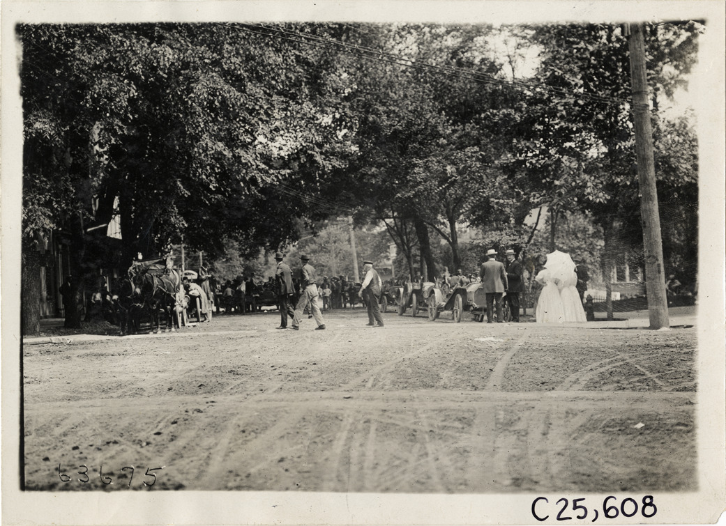 Motorists and spectators with automobiles on tree-lined street, 1910 Munsey Historic Tour
