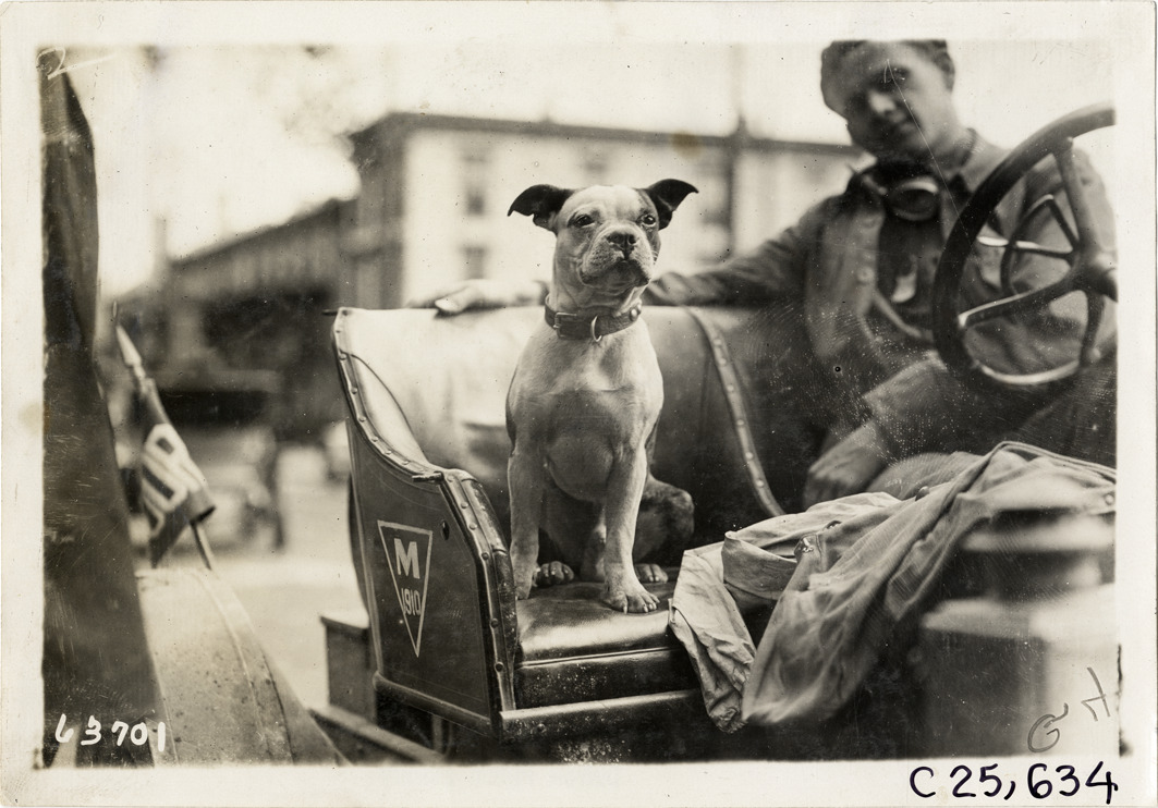 View of dog sitting next to driver in front seat of car during the 1910 Munsey Historic Tour. Organized by the Munsey newspapers, the endurance contest covered a route through ten states. Stamped on back: "Spooner & Wells, Inc., photographers, telephones 3472-3473 Columbus, 1931 Broadway, New York." Handwritten on back: "Tours--Munsey Historic Tour, 1910."