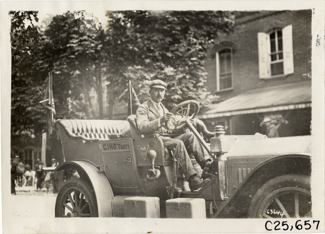 Driver posing in Cino automobile, 1910 Munsey Historic Tour