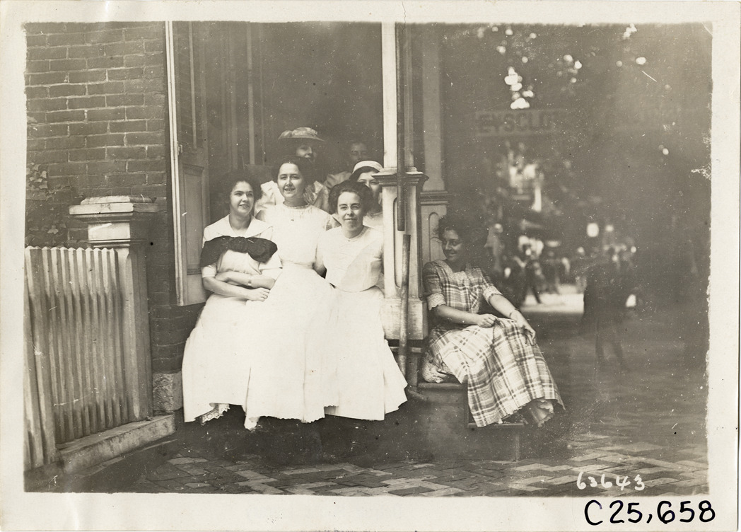 View of women posing on porch during the 1910 Munsey Historic Tour. Organized by the Munsey newspapers, the endurance contest covered a route through ten states. Stamped on back: "Spooner & Wells, Inc., photographers, telephones 3472-3473 Columbus, 1931 Broadway, New York." Handwritten on back: "Tours--Munsey Historic Tour, 1910."