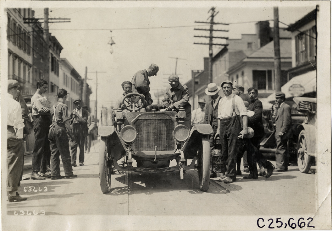 View of motorists in Warren-Detroit car no. 10 during the 1910 Munsey Historic Tour. Spectators stand nearby. Organized by the Munsey newspapers, the endurance contest covered a route through ten states. Stamped on back: "Spooner & Wells, Inc., photographers, telephones 3472-3473 Columbus, 1931 Broadway, New York." Handwritten on back: "Tours--Munsey Historic Tour, 1910."