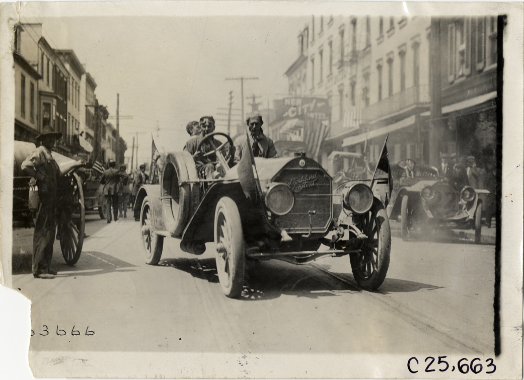 View of motorists in Stoddard-Dayton car at Buffalo, New York during the 1910 Munsey Historic Tour. New City Hotel in background. Organized by the Munsey newspapers, the endurance contest covered a route through ten states. Stamped on back: "Spooner & Wells, Inc., photographers, telephones 3472-3473 Columbus, 1931 Broadway, New York." Handwritten on back: "Tours--Munsey Historic Tour, 1910."