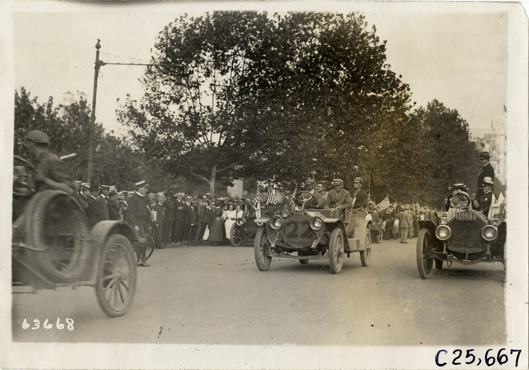 View of motorists in Cino car no. 22 during the 1910 Munsey Historic Tour. Spectators in background; unidentified car on right. Organized by the Munsey newspapers, the endurance contest covered a route through ten states. Stamped on back: "Spooner & Wells, Inc., photographers, telephones 3472-3473 Columbus, 1931 Broadway, New York." Handwritten on back: "Tours--Munsey Historic Tour, 1910."