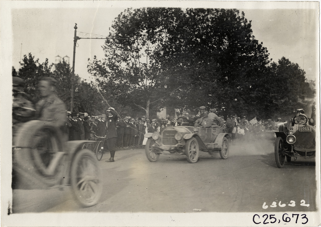 View of motorists in Pierce-Racine car no. 16 during the 1910 Munsey Historic Tour. Spectators and policeman with bicycle in background; unidentified car on right. Organized by the Munsey newspapers, the endurance contest covered a route through ten states. Stamped on back: "Spooner & Wells, Inc., photographers, telephones 3472-3473 Columbus, 1931 Broadway, New York." Handwritten on back: "Tours--Munsey Historic Tour, 1910."