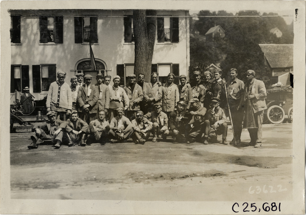 View of group of motorists posing in front of house during the 1910 Munsey Historic Tour. Organized by the Munsey newspapers, the endurance contest covered a route through ten states. Stamped on back: "Spooner & Wells, Inc., photographers, telephones 3472-3473 Columbus, 1931 Broadway, New York." Handwritten on back: "Tours--Munsey Historic Tour, 1910."