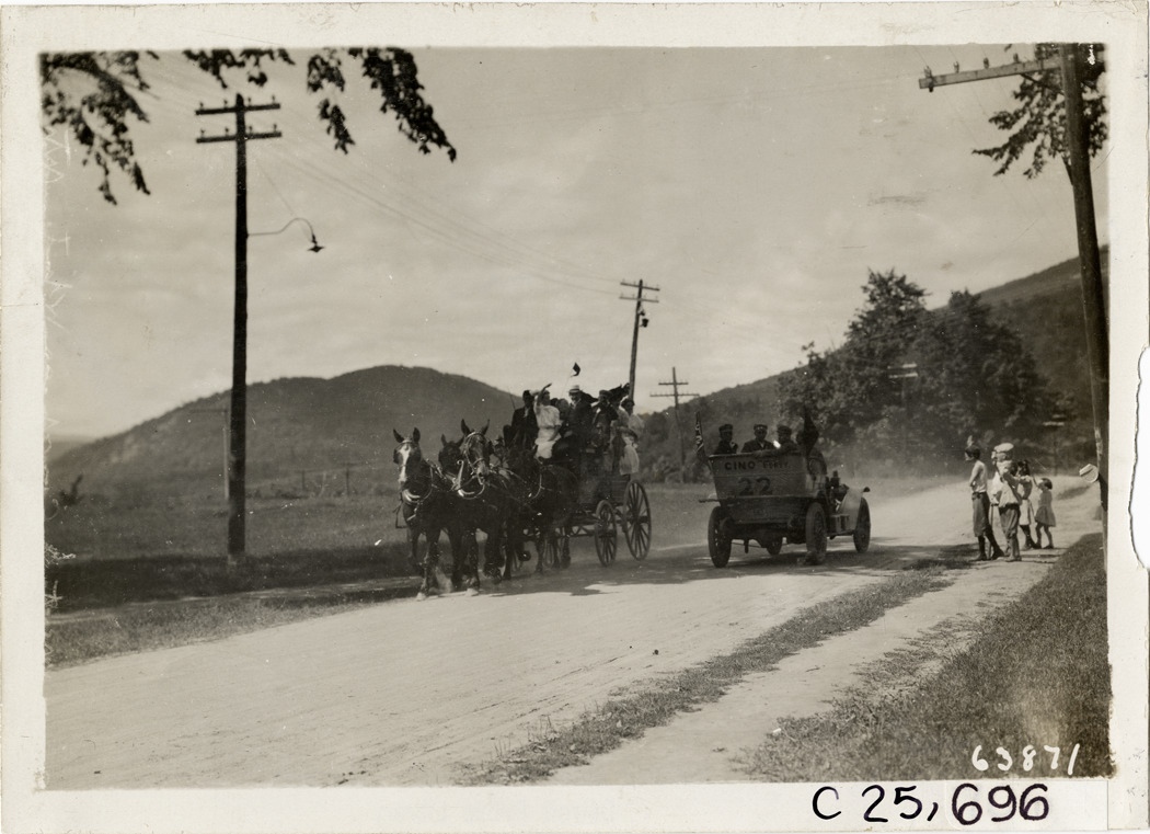 View of motorists in Cino car no. 22 passing horse-drawn wagon on rural dirt road during the 1910 Munsey Historic Tour. Children wave from roadside. Organized by the Munsey newspapers, the endurance contest covered a route through ten states. Stamped on back: "Spooner & Wells, Inc., photographers, telephones 3472-3473 Columbus, 1931 Broadway, New York." Handwritten on back: "Tours--Munsey Historic Tour, 1910."
