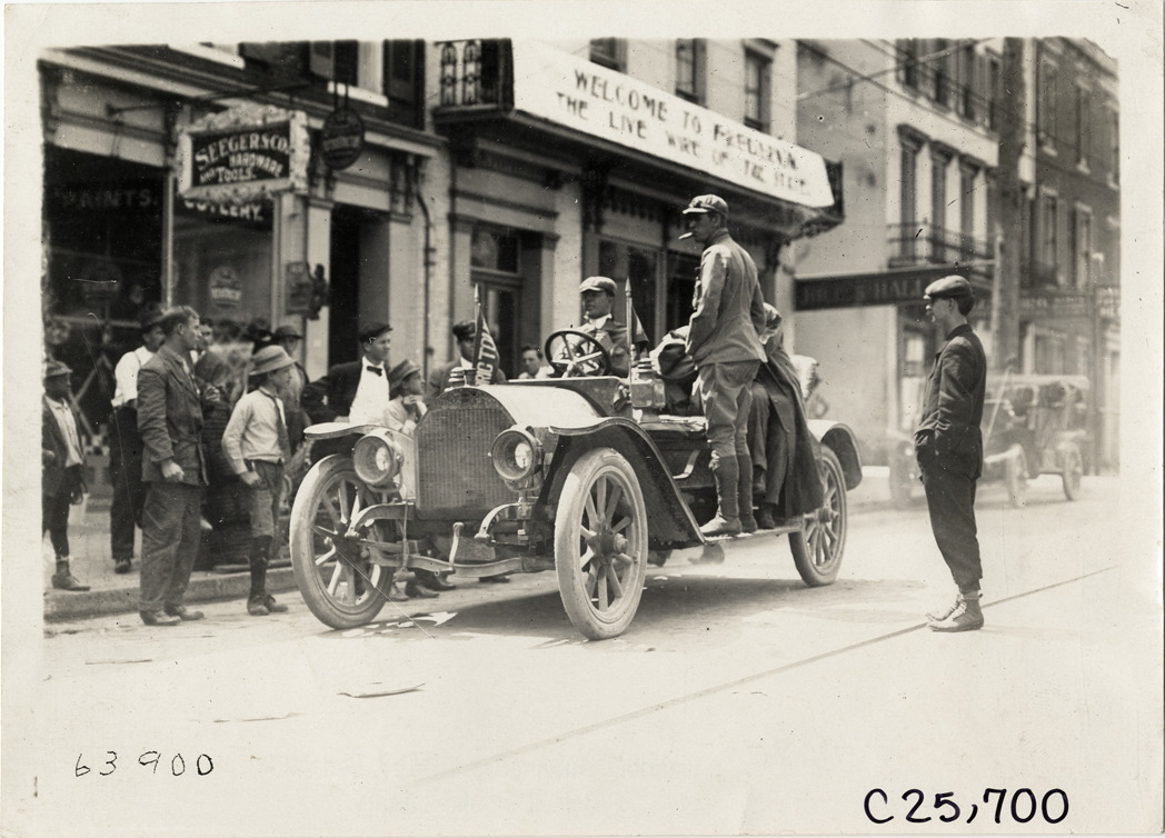 View of motorists with car during the 1910 Munsey Historic Tour. Seeger & Co. hardware store in background. Organized by the Munsey newspapers, the endurance contest covered a route through ten states. Stamped on back: "Spooner & Wells, Inc., photographers, telephones 3472-3473 Columbus, 1931 Broadway, New York." Handwritten on back: "Tours--Munsey Historic Tour, 1910."