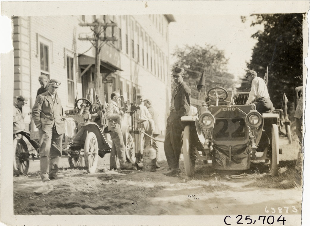 View of motorists fueling Cino car no. 22 during the 1910 Munsey Historic Tour. Unidentified car and gasoline pump on left. Organized by the Munsey newspapers, the endurance contest covered a route through ten states. Stamped on back: "Spooner & Wells, Inc., photographers, telephones 3472-3473 Columbus, 1931 Broadway, New York." Handwritten on back: "Tours--Munsey Historic Tour, 1910."