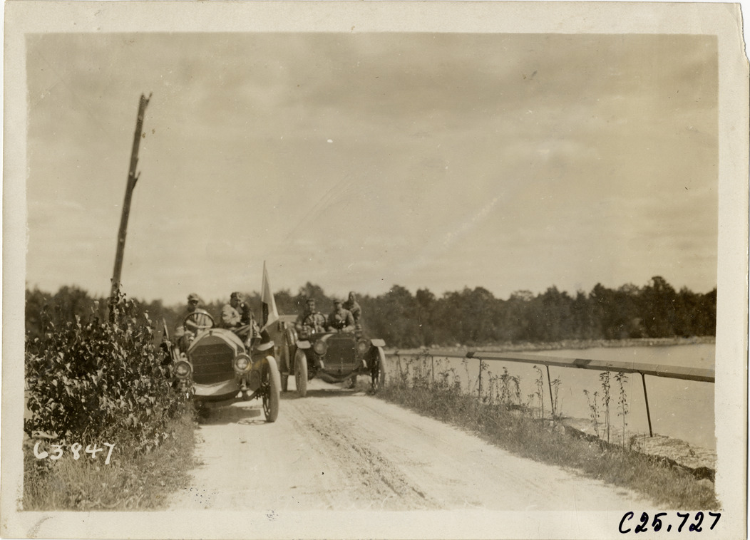 View of motorists in two cars traveling on dirt road adjacent to lake during the 1910 Munsey Historic Tour. Organized by the Munsey newspapers, the endurance contest covered a route through ten states. Stamped on back: "Spooner & Wells, Inc., photographers, telephones 3472-3473 Columbus, 1931 Broadway, New York." Handwritten on back: "Tours--Munsey Historic Tour, 1910."