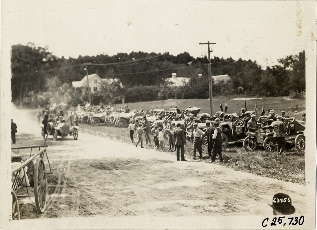 Motorists with automobiles parked on roadside, 1910 Munsey Historic Tour