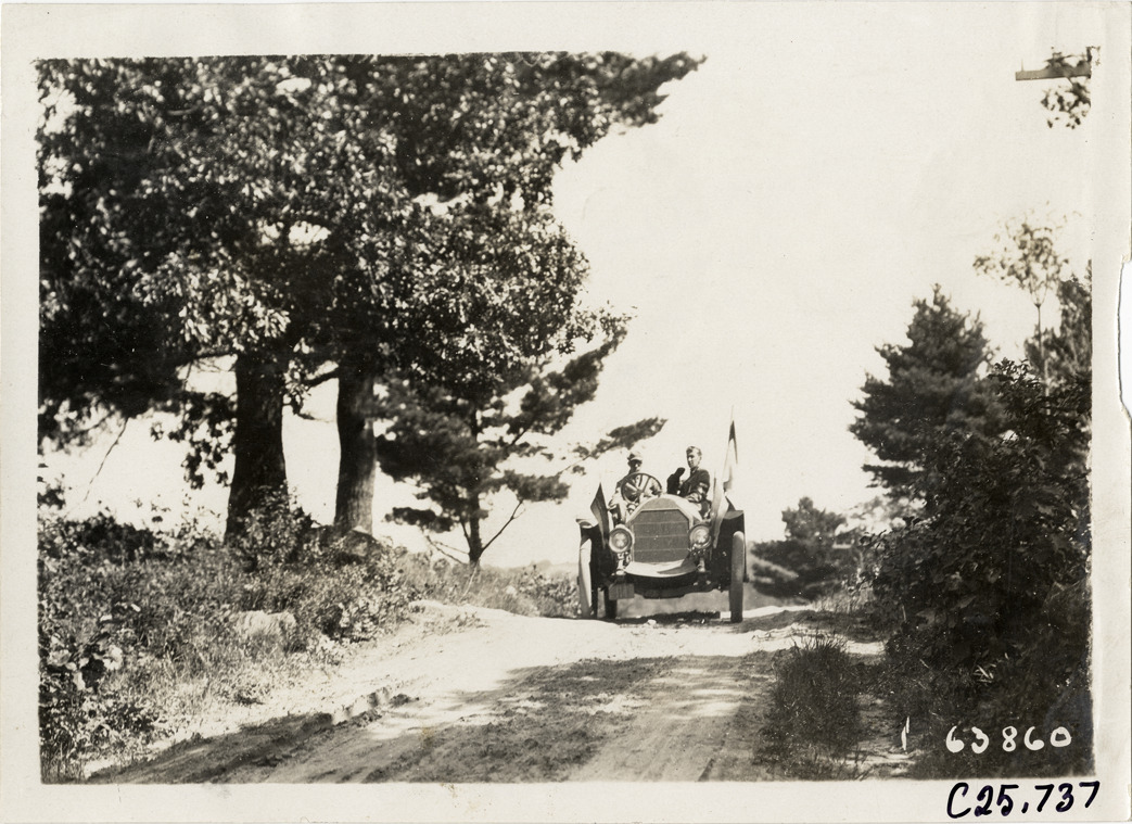 View of motorists in car traveling on rural dirt road during the 1910 Munsey Historic Tour. Organized by the Munsey newspapers, the endurance contest covered a route through ten states. Stamped on back: "Spooner & Wells, Inc., photographers, telephones 3472-3473 Columbus, 1931 Broadway, New York." Handwritten on back: "Tours--Munsey Historic Tour, 1910."