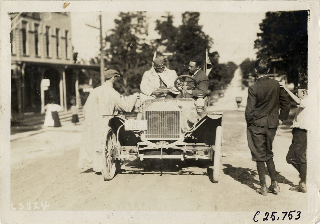 View of motorists with Ford car no. 30 during the 1910 Munsey Historic Tour. Organized by the Munsey newspapers, the endurance contest covered a route through ten states. Stamped on back: "Spooner & Wells, Inc., photographers, telephones 3472-3473 Columbus, 1931 Broadway, New York." Handwritten on back: "Tours--Munsey Historic Tour, 1910."