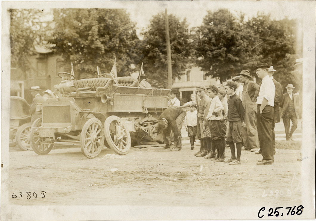 View of group of boys and other onlookers watching motorist repair Randolph truck during the 1910 Munsey Historic Tour. Organized by the Munsey newspapers, the endurance contest covered a route through ten states. Stamped on back: "Spooner & Wells, Inc., photographers, telephones 3472-3473 Columbus, 1931 Broadway, New York." Handwritten on back: "Tours--Munsey Historic Tour, 1910."