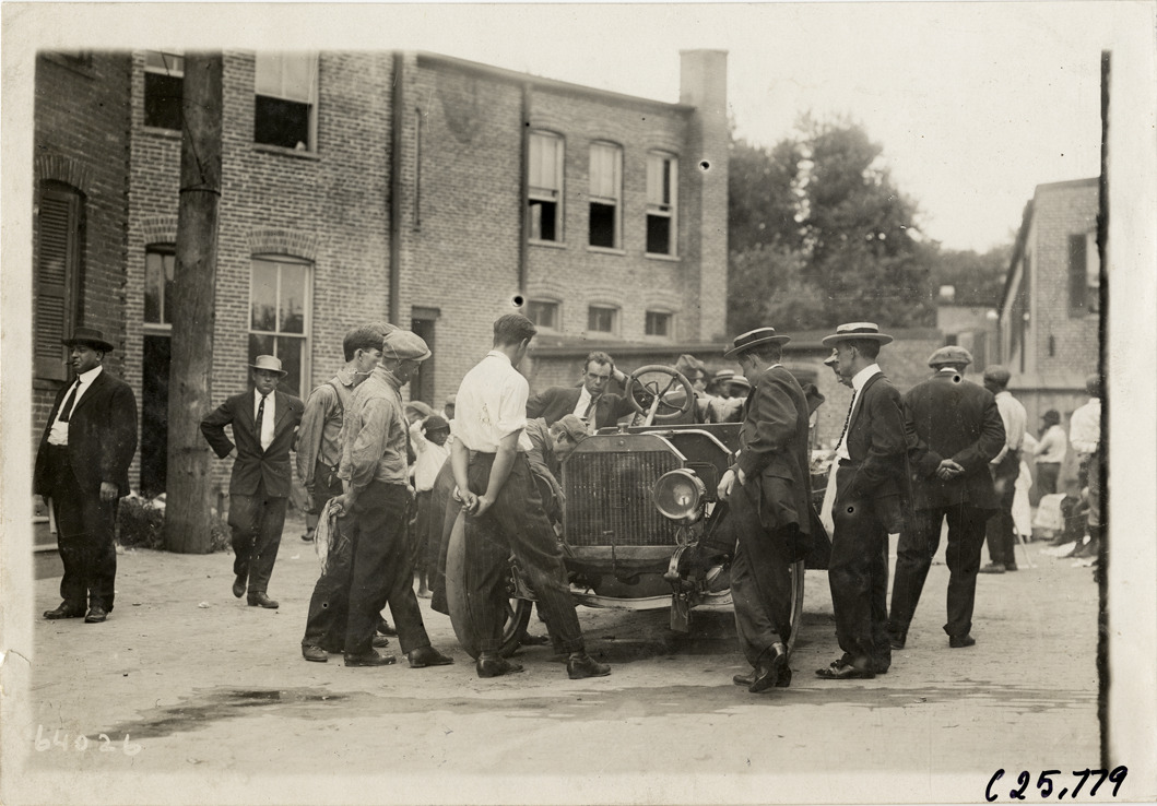 View of spectators surrounding Warren-Detroit car no. 10 during the 1910 Munsey Historic Tour. Brick row houses or apartment buildings in background. Organized by the Munsey newspapers, the endurance contest covered a route through ten states. Stamped on back: "Spooner & Wells, Inc., photographers, telephones 3472-3473 Columbus, 1931 Broadway, New York." Handwritten on back: "Tours--Munsey Historic Tour, 1910."