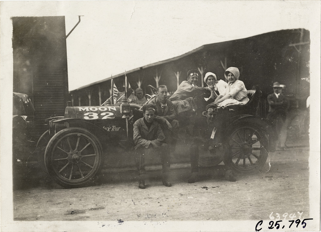 View of men and women posing with Moon car no. 32 during the 1910 Munsey Historic Tour. Organized by the Munsey newspapers, the endurance contest covered a route through ten states. Stamped on back: "Spooner & Wells, Inc., photographers, telephones 3472-3473 Columbus, 1931 Broadway, New York." Handwritten on back: "Tours--Munsey Historic Tour, 1910."