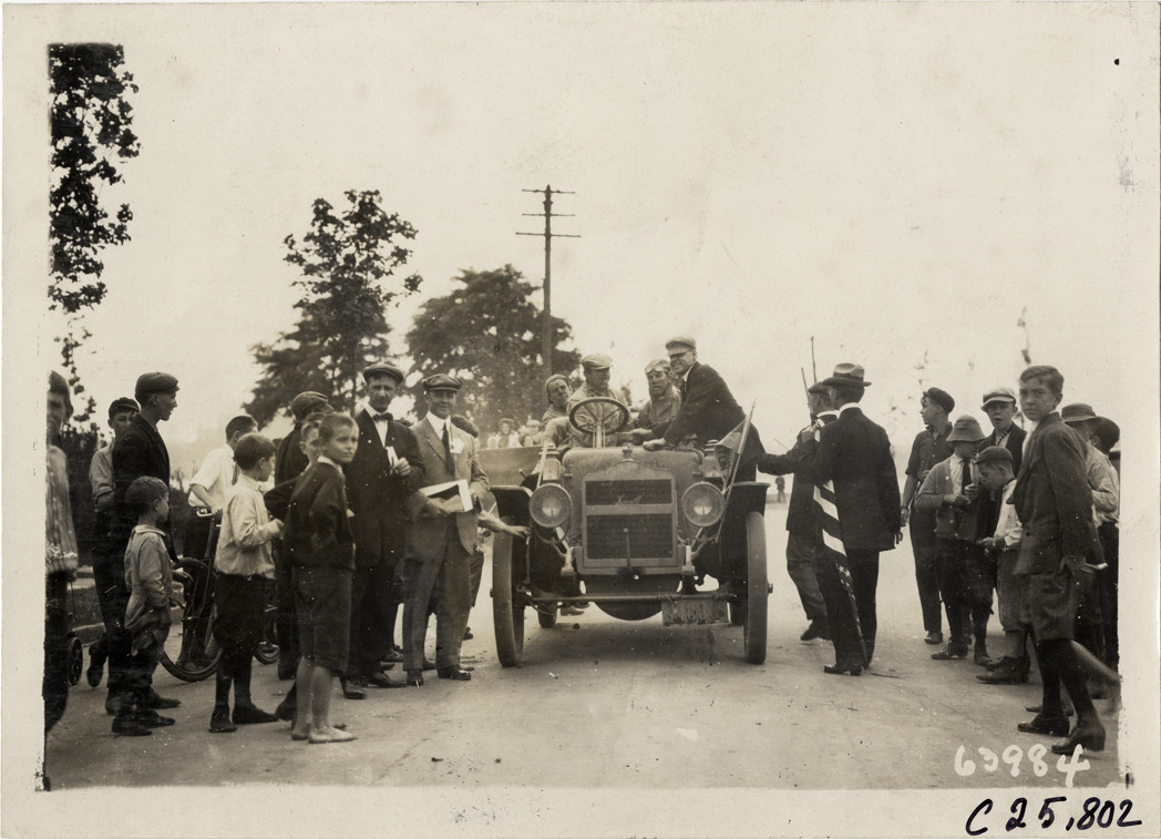 View of spectators surrounding motorists in Maxwell car during the 1910 Munsey Historic Tour. Organized by the Munsey newspapers, the endurance contest covered a route through ten states. Stamped on back: "Spooner & Wells, Inc., photographers, telephones 3472-3473 Columbus, 1931 Broadway, New York." Handwritten on back: "Tours--Munsey Historic Tour, 1910."