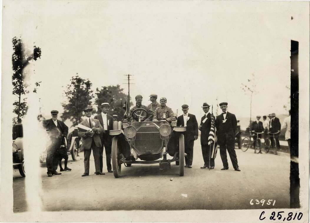 Officials posing with motorists in automobile, 1910 Munsey Historic Tour