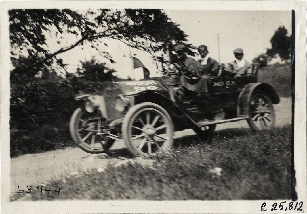 View of motorists in Moon car no. 32 during the 1910 Munsey Historic Tour. Organized by the Munsey newspapers, the endurance contest covered a route through ten states. Stamped on back: "Spooner & Wells, Inc., photographers, telephones 3472-3473 Columbus, 1931 Broadway, New York." Handwritten on back: "Tours--Munsey Historic Tour, 1910."