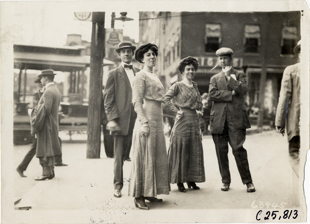 View of two men and two women posing on sidewalk during the 1910 Munsey Historic Tour. Organized by the Munsey newspapers, the endurance contest covered a route through ten states. Stamped on back: "Spooner & Wells, Inc., photographers, telephones 3472-3473 Columbus, 1931 Broadway, New York." Handwritten on back: "Tours--Munsey Historic Tour, 1910."