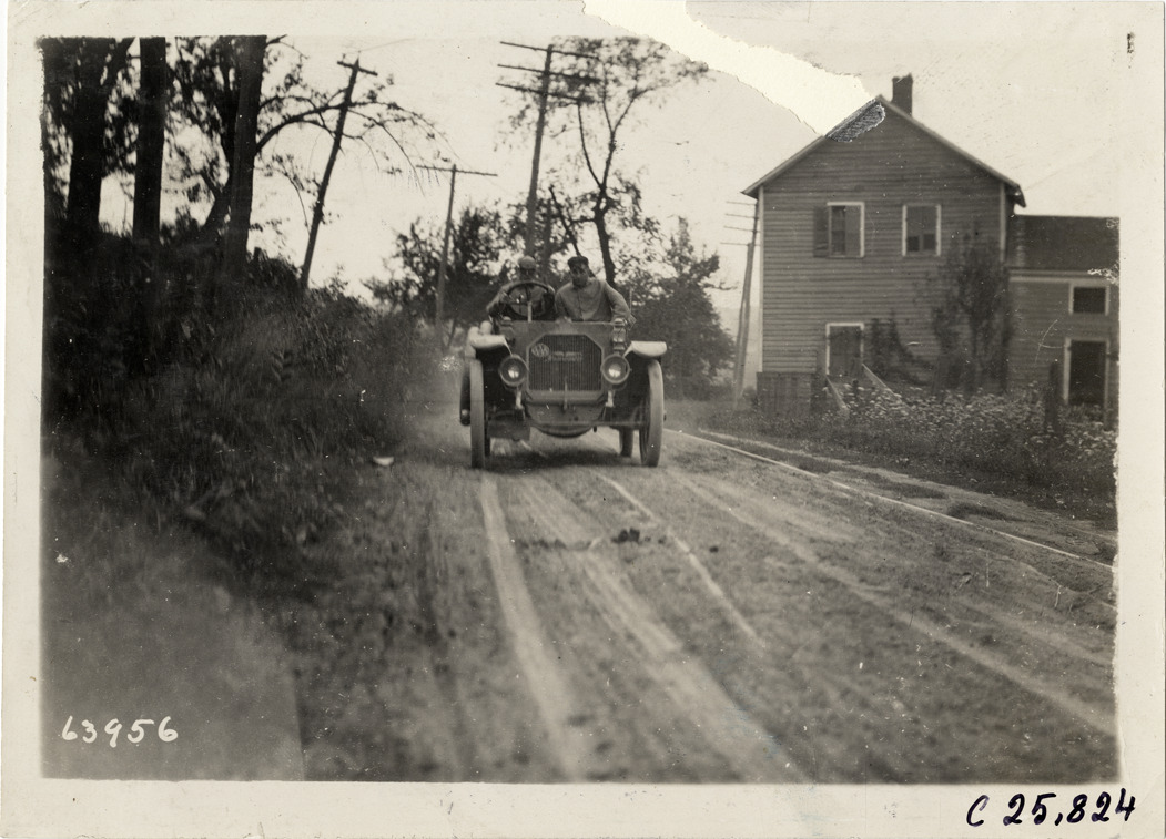 View of motorists in Great Western car no. 18 traveling on rural dirt road during the 1910 Munsey Historic Tour. Wooden-frame house on roadside. Organized by the Munsey newspapers, the endurance contest covered a route through ten states. Stamped on back: "Spooner & Wells, Inc., photographers, telephones 3472-3473 Columbus, 1931 Broadway, New York." Handwritten on back: "Tours--Munsey Historic Tour, 1910."