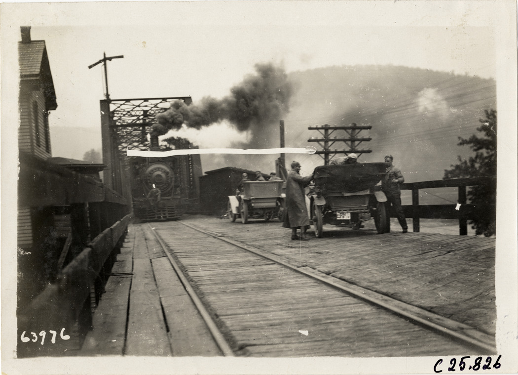 Automobiles and locomotive on railroad bridge, 1910 Munsey Historic Tour