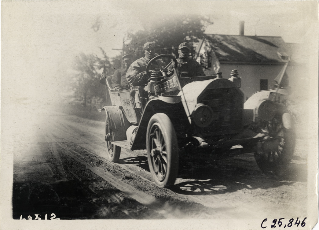 View of motorists in Ohio car no. 21 traveling on rural dirt road during the 1910 Munsey Historic Tour. House on roadside. Organized by the Munsey newspapers, the endurance contest covered a route through ten states. Stamped on back: "Spooner & Wells, Inc., photographers, telephones 3472-3473 Columbus, 1931 Broadway, New York." Handwritten on back: "Tours--Munsey Historic Tour, 1910."