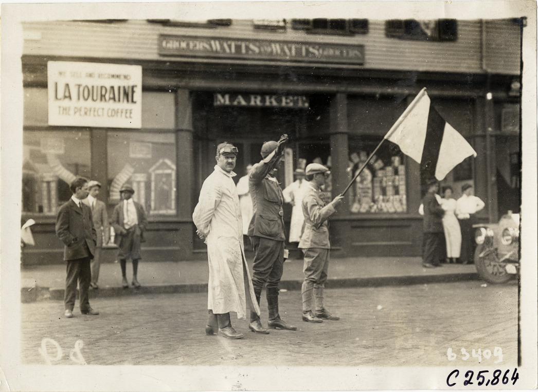 View of an official and two motorists flagging down cars during the 1910 Munsey Historic Tour. Watts and Watts market in background. Organized by the Munsey newspapers, the endurance contest covered a route through ten states. Stamped on back: "Spooner & Wells, Inc., photographers, telephones 3472-3473 Columbus, 1931 Broadway, New York." Handwritten on back: "Tours--Munsey Historic Tour, 1910."
