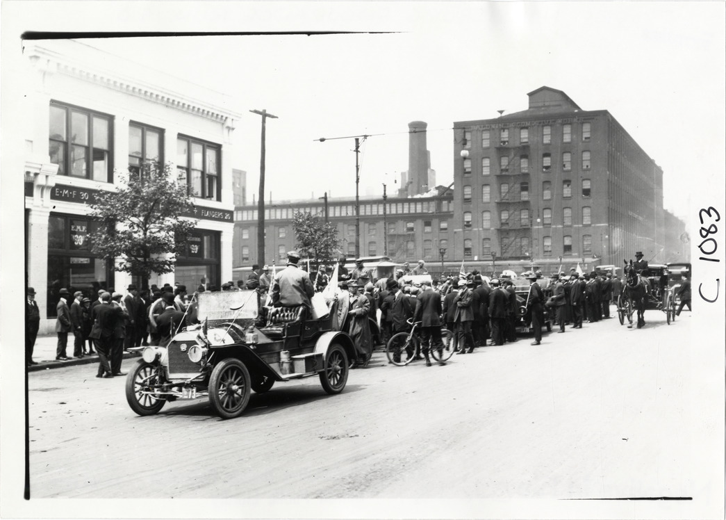 View of crowd of spectators surrounding cars in street during the 1910 Harrisburg Endurance Run. Baldwin Locomotive Works building in background. The Motor Club of Harrisburg, Pennsylvania sponsored spring and fall reliability contests which covered routes through Pennsylvania, Maryland and New Jersey. Handwritten on back: "Tours--Harrisburg Endurance Run, 1910."