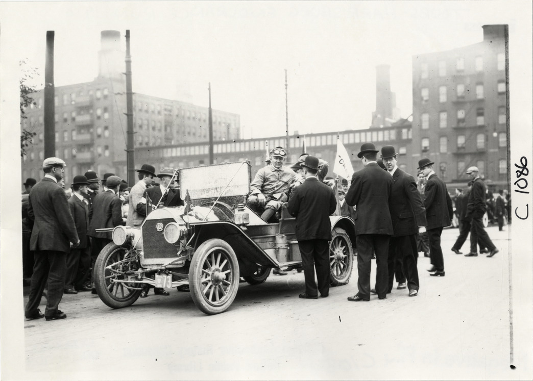 Spectators surrounding motorists in automobile, 1910 Harrisburg Endurance Run