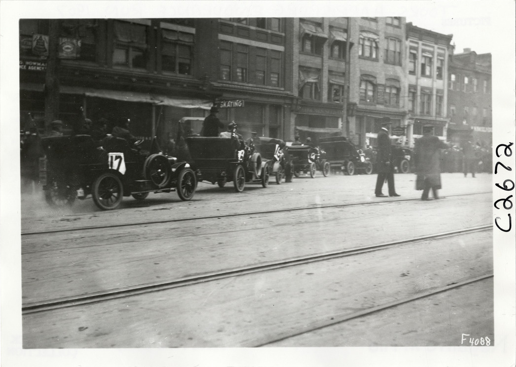Motorists with automobiles lined up in street, 1907 Harrisburg Endurance Run