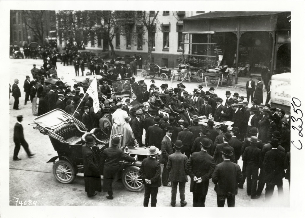 View of crowd surrounding cars in street during the 1907 Harrisburg Endurance Run. Sponsored by the Motor Club of Harrisburg, Pennsylvania, the contest covered routes in Pennsylvania. Handwritten on back: "Tours--Harrisburg Endurance Run, 1907."