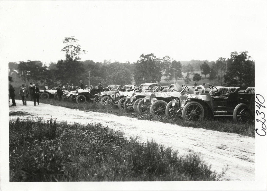 Automobiles lined up in road, 1910 Montauk Point Reliability Run