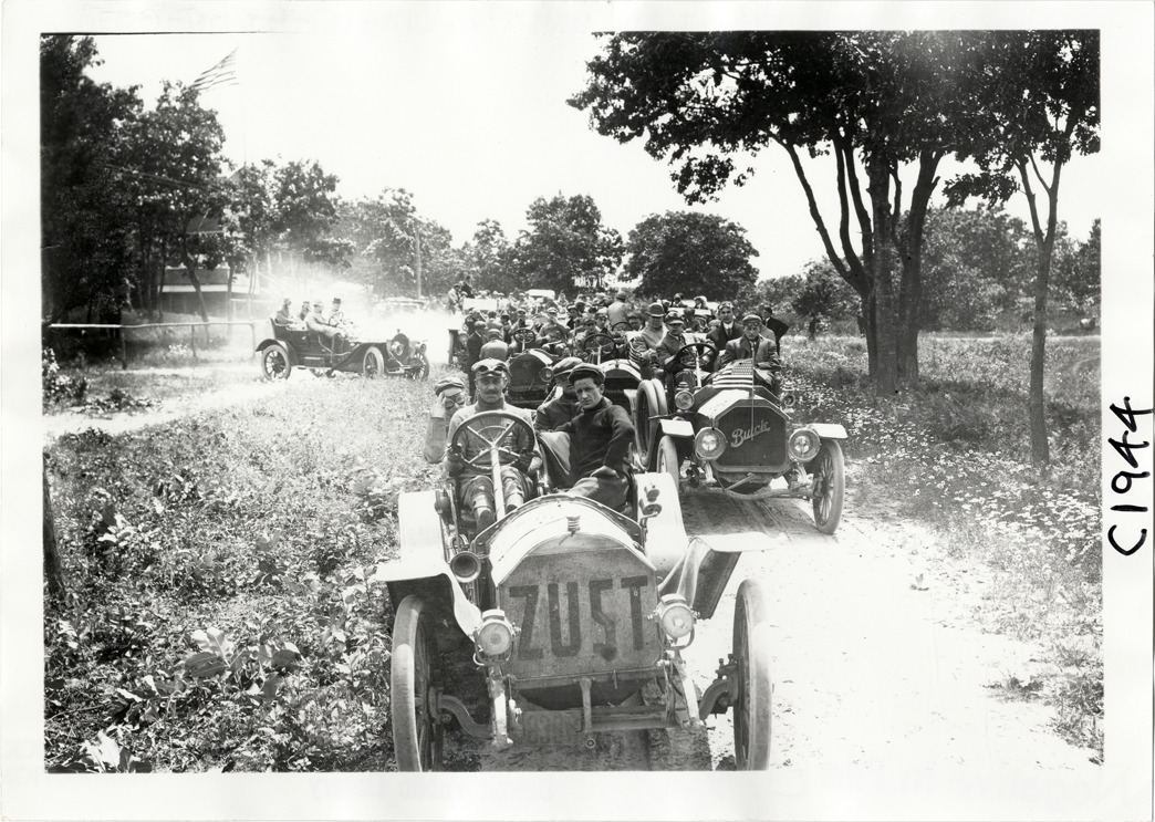 View of motorists in cars lined up in road during the 1910 Montauk Point Reliability Run. Zust and Buick cars in foreground. Sponsored by the Motor Contest Association, the two-day endurance run, also known as the "Montauk Light or Bust" reliability run, took place on Long Island. Handwritten on back: "Tours--Montauk Light or Bust Reliability Run, 1910."