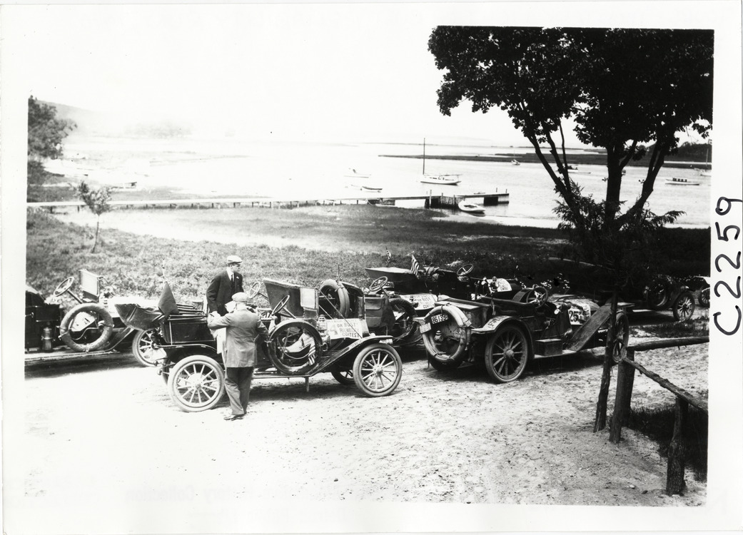 View of cars parked on road near lake during the 1910 Montauk Point Reliability Run. Haynes car no. 4 and American car no. 25 in foreground. Sponsored by the Motor Contest Association, the two-day endurance run, also known as the "Montauk Light or Bust" reliability run, took place on Long Island. Handwritten on back: "Tours--Montauk Light or Bust Reliability Run, 1910."
