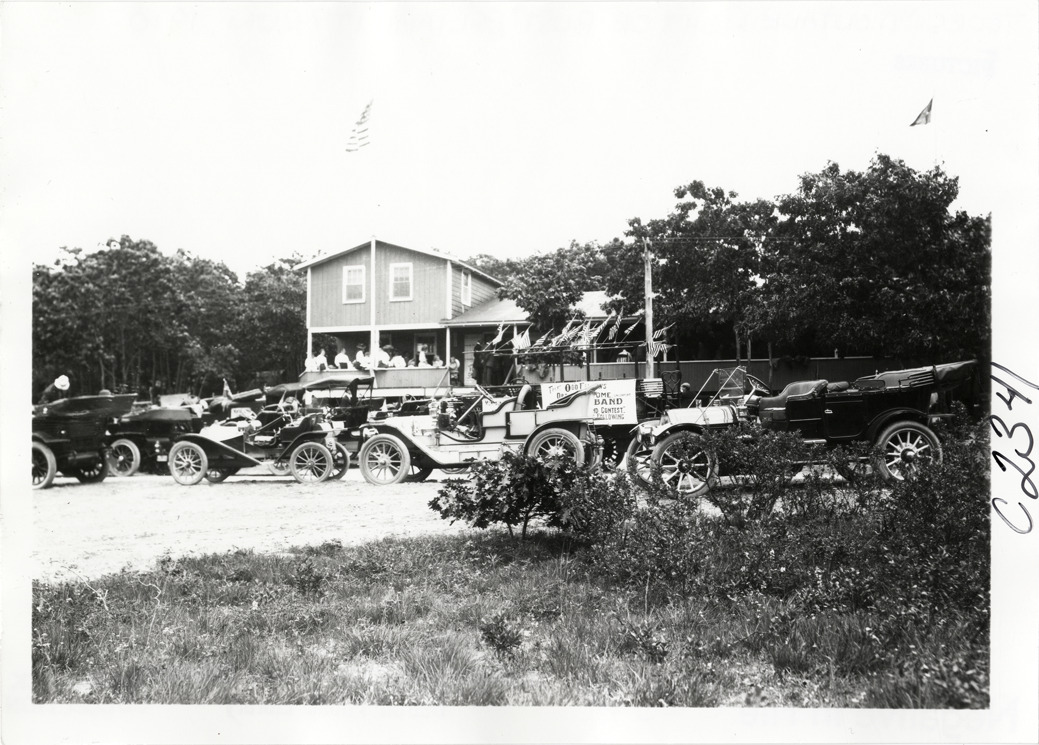 View of cars parked in front of wooden-frame building during the 1910 Montauk Point Reliability Run. Men and women gather on veranda. Sponsored by the Motor Contest Association, the two-day endurance run, also known as the "Montauk Light or Bust" reliability run, took place on Long Island. Handwritten on back: "Tours--Montauk Light or Bust Reliability Run, 1910."