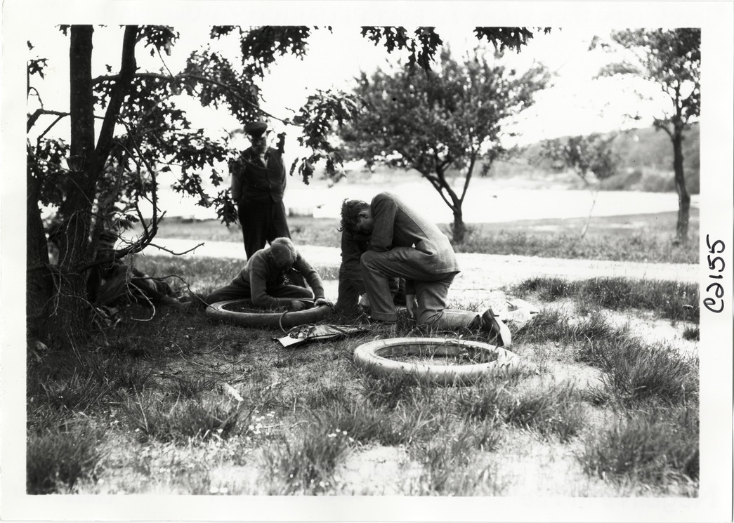 Motorists fixing tires on roadside, 1910 Montauk Point Reliability Run
