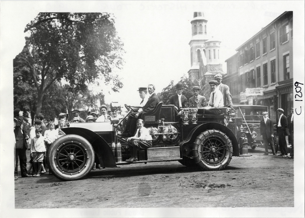 Motorists posing in Independent Hose Company fire engine, 1910 Munsey Historic Tour