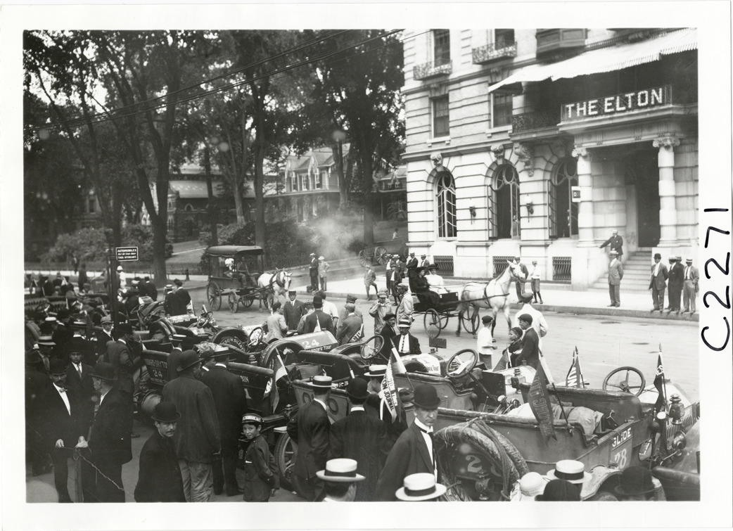 View of cars lined up in street in front of the Elton Hotel at Waterbury, Connecticut during the 1910 Munsey Historic Tour. Horse-drawn wagon and carriage travel past hotel; spectators in foreground. Organized by the Munsey newspapers, the endurance contest covered a route through ten states. Handwritten on back: "Tours--Munsey Historic Tour, 1910."
