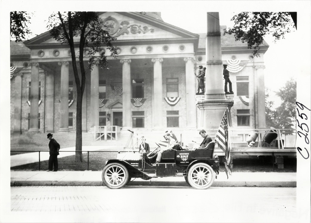 E-M-F pathfinder automobile parked in front of Neoclassical building and soldiers' monument, 1910 Munsey Historic Tour