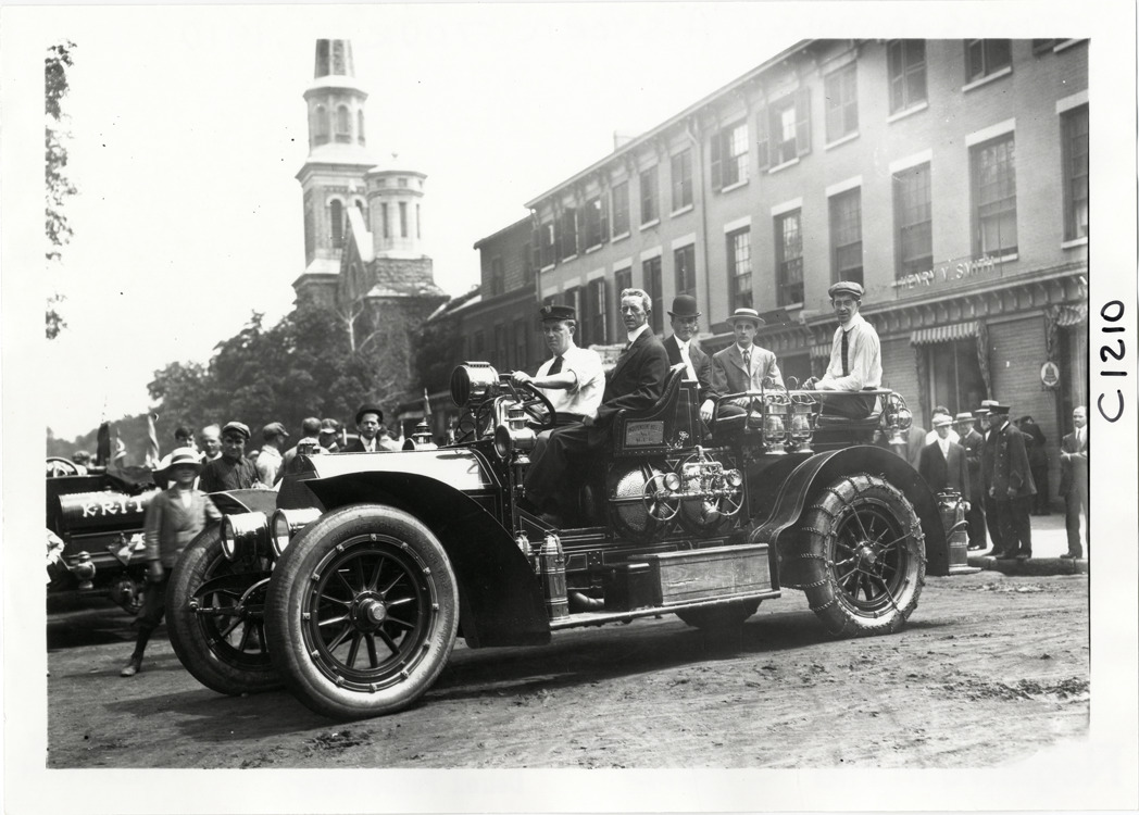 Motorists posing in Independent Hose Company fire engine, 1910 Munsey Historic Tour