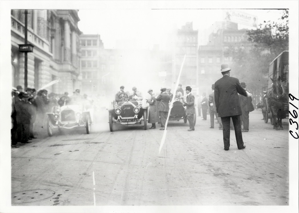 View of motorists with three cars, parked side by side, in street during the 1910 Munsey Historic Tour. Policeman stands in foreground. Organized by the Munsey newspapers, the endurance contest covered a route through ten states. Handwritten on back: "Tours--Munsey Historic Tour, 1910."